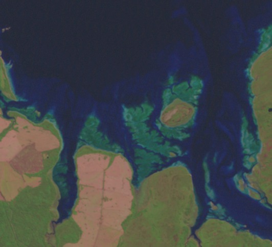 This sure does look like a dense kelp forest, bright green blobs right off the coast, but in fact these are tidal mudflats. This can be one of the most difficult issues you may face. Algae or seagrass growing on these mudflats is going to show a similar green color as kelp, but we know that giant kelp only grows on hard seafloor, like rocks and boulders.